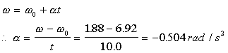 Problem 8-24. After 10.0 s, a spinning roulette wheel has slowed down to an angular speed of 1.88 rad/s. During this time, the wheel rotates through an angle of 44.0 rad. Determine the angular acceleration.