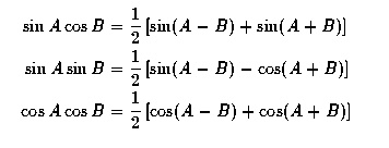\sin A \sin B &= \frac{1}{2}\left[ \sin(A-B)-\cos(A+B) \right] \\