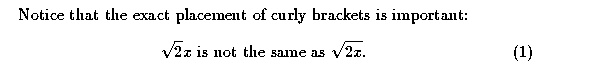 The equations are numbered by LaTeX during the actual processing of the source file, so the number that LaTeX assigns to a given equation can change if we insert other equations before it. Later on we will see how to create a label for an equation so that we can refer to the equation in the paper without having to know which number will be assigned to it during typesetting. That makes it easy to change our document without having to change all the cross references --- one extremely handy feature of LaTeX.
